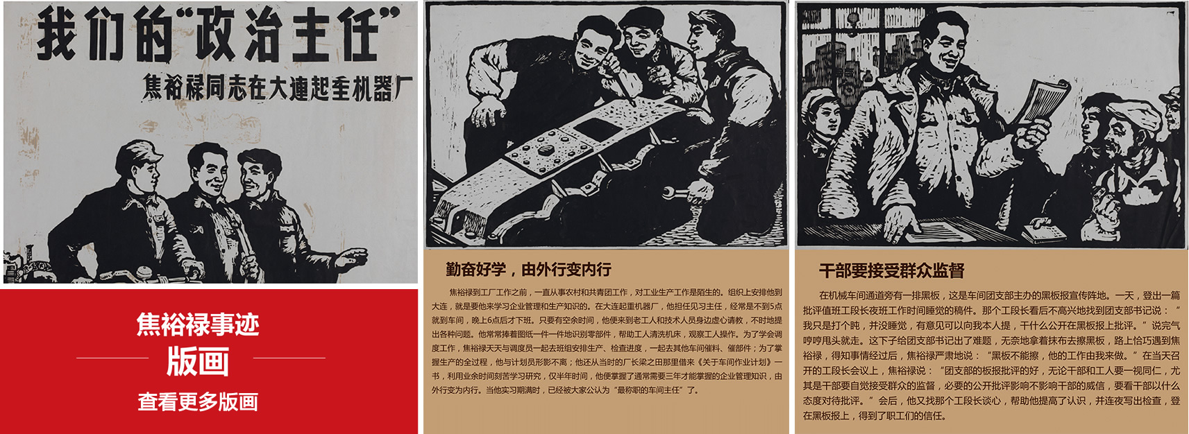 这是由原大连起重机器厂(即大连华锐重工集团股份有限公司的控股股东——大连重工·起重集团前身企业)工人业余美术组根据焦裕禄在大连起重机器厂留下的感人事迹,创作了14幅版画--我们的“政治主任”,刊登在1966年4月17日的《旅大日报》上。版画原作现收藏在中国美术馆。