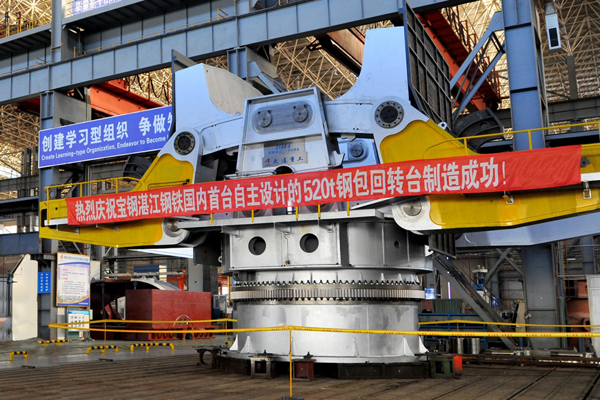 大包转台安装在连铸车间钢水接受跨和连铸跨之间的浇铸平台上,用于接受炼钢系统送来的盛满钢水的钢包,将钢包转至连铸跨的浇注位置进行浇注。大连重工研制的大包转台产品单臂承载能力从42吨到520吨,尤其是大吨位(大于200吨)钢包回转台国内市场占有率很高,产品功能从单一回转型发展到多功能型。