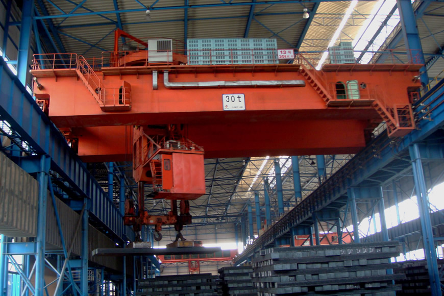 钢锭夹钳起重机是将冷钢锭装入均热炉或将加热完成的红热钢锭从炉中取出的起重设备。大连重工研制的钢锭夹钳起重机规格包括:20t、40t、45t、60t、65t。